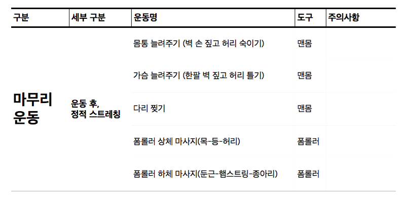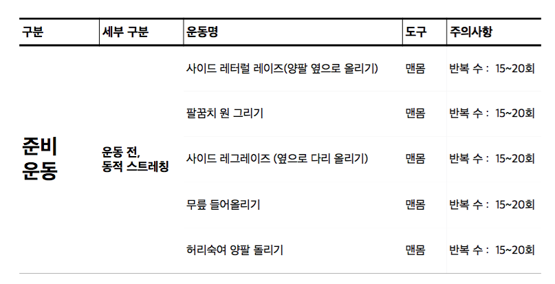동적 스트레칭: 관절 가동범위와 근육의 부상방지를 위함 / 중량운동 전 시행
